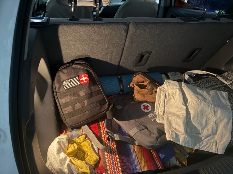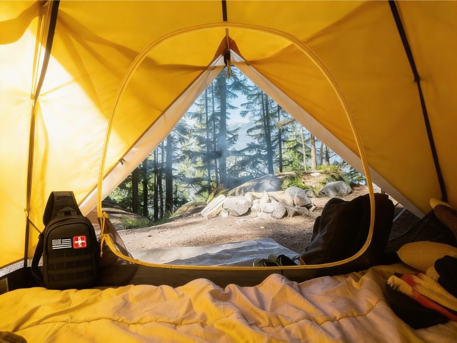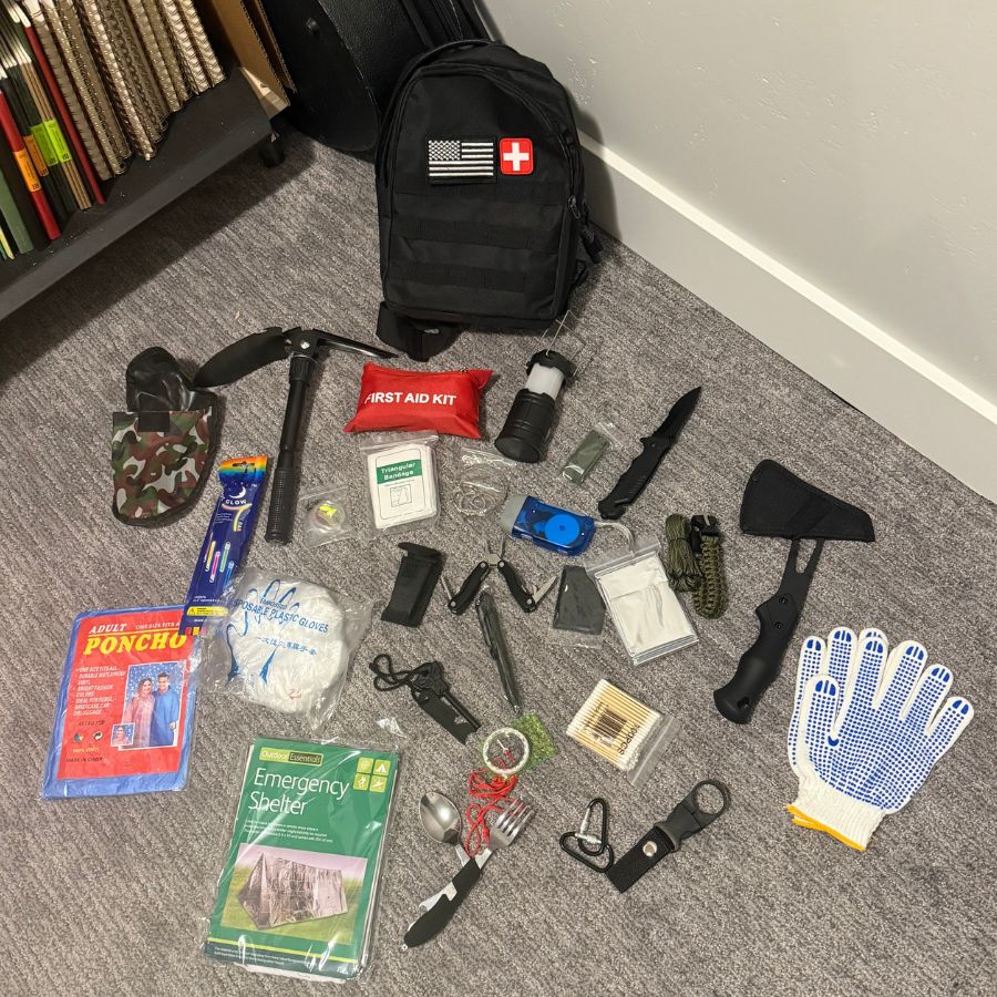 Parachute cord, emergency tent, camp light, raincoat, thermal blanket