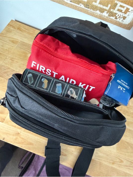 Tourniquet, wound pads, bandages, sanitizers, tweezers, scissors, gloves